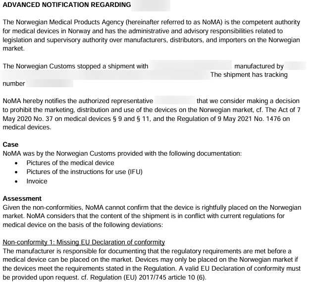 의료기기 제품에 문제가 발생한 경우, 관할 당국은 공문을 발송하고 관련 자료 제출을 요구합니다.