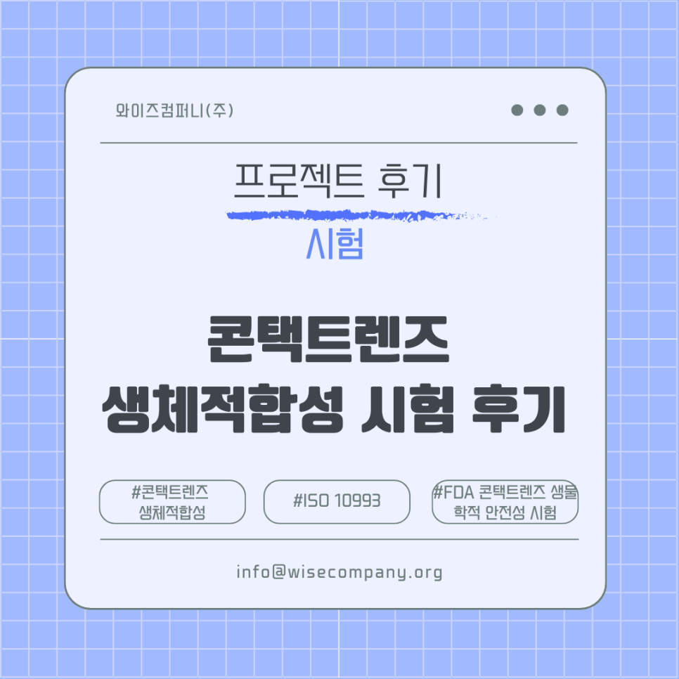와이즈컴퍼니(주)를 통해 수행된 생체적합성 시험은미국, 유럽, 국내 등 여러 규제 기관에서 적절하게 사용되고 있습니다. 안녕하세요.국내외 제품 인허가 및 품질 시스템 인증 전문 컨설팅 와이즈컴퍼니(주) 입니다. 와이즈컴퍼니(주)는 고객분들이 빠르게 변화하는 규제적 요구사항에 맞춰 대처할 수 있도록 도와드리고 있습니다.와이즈컴퍼니(주)는 국내 최초로 인도 GLP 시험소와 협력하여, FDA GLP 기준 (21 CFR Part 58) 및 OECD GLP를 준수한 생체적합성 시험 서비스를 제공하고 있습니다. 지금까지 수천 건의 시험 보고서를 성공적으로 완료하였으며, 이 보고서들은 각국 규제 기관에서 신뢰도 높은 자료로 활용되고 있습니다.이번 포스팅은 여러 제품 중 콘택트렌즈 (Contact lens) 제..